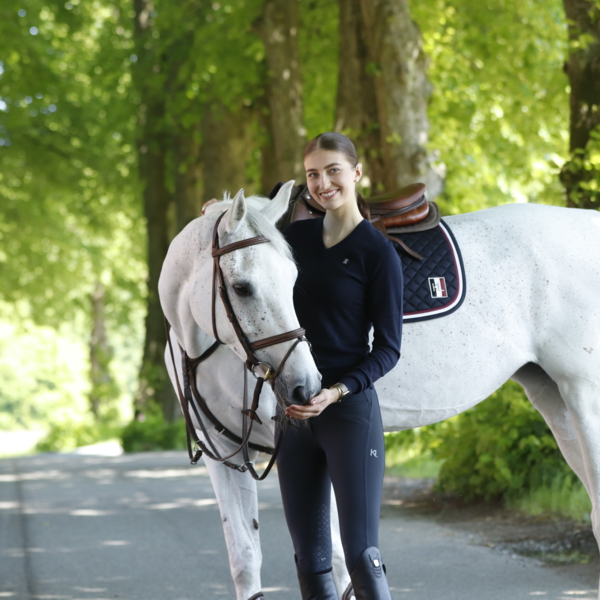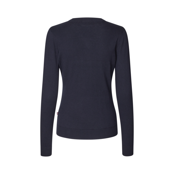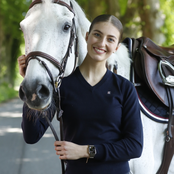 The Classic Ladies V-neck Pullovers offers a luxurious and clean look. The soft cotton and cashmere blend unites in a amazing handfeel. The clean design makes it a staple item for every equestrian on or of the riding track.