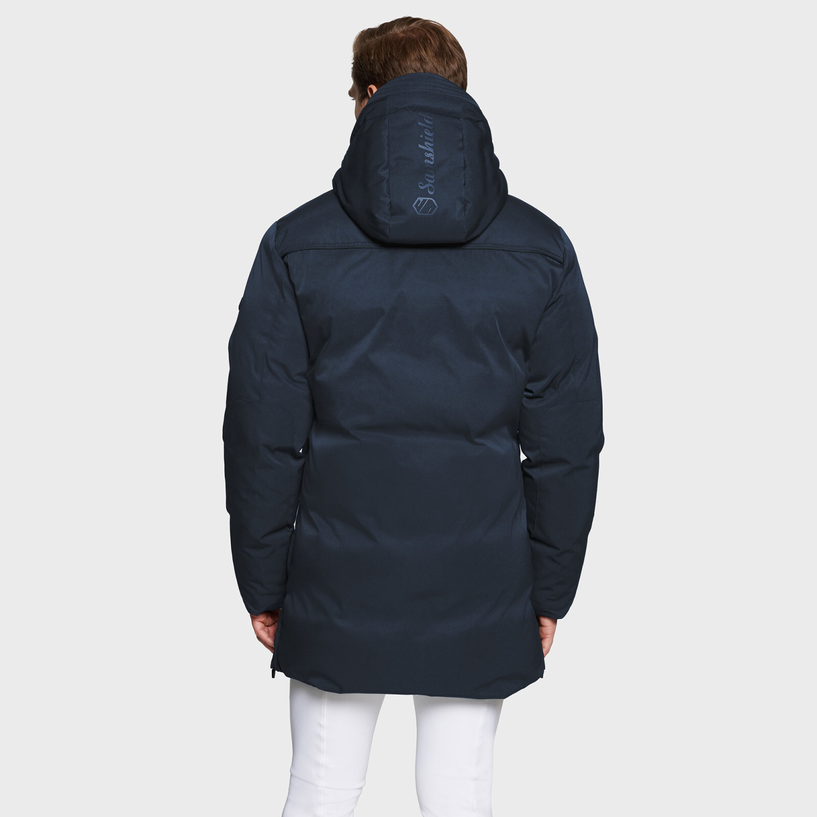 Martin men's mid-length hooded down jacket with side openings. Ideal for riders wanting to stay warm and dry while riding, with a thigh-high style.