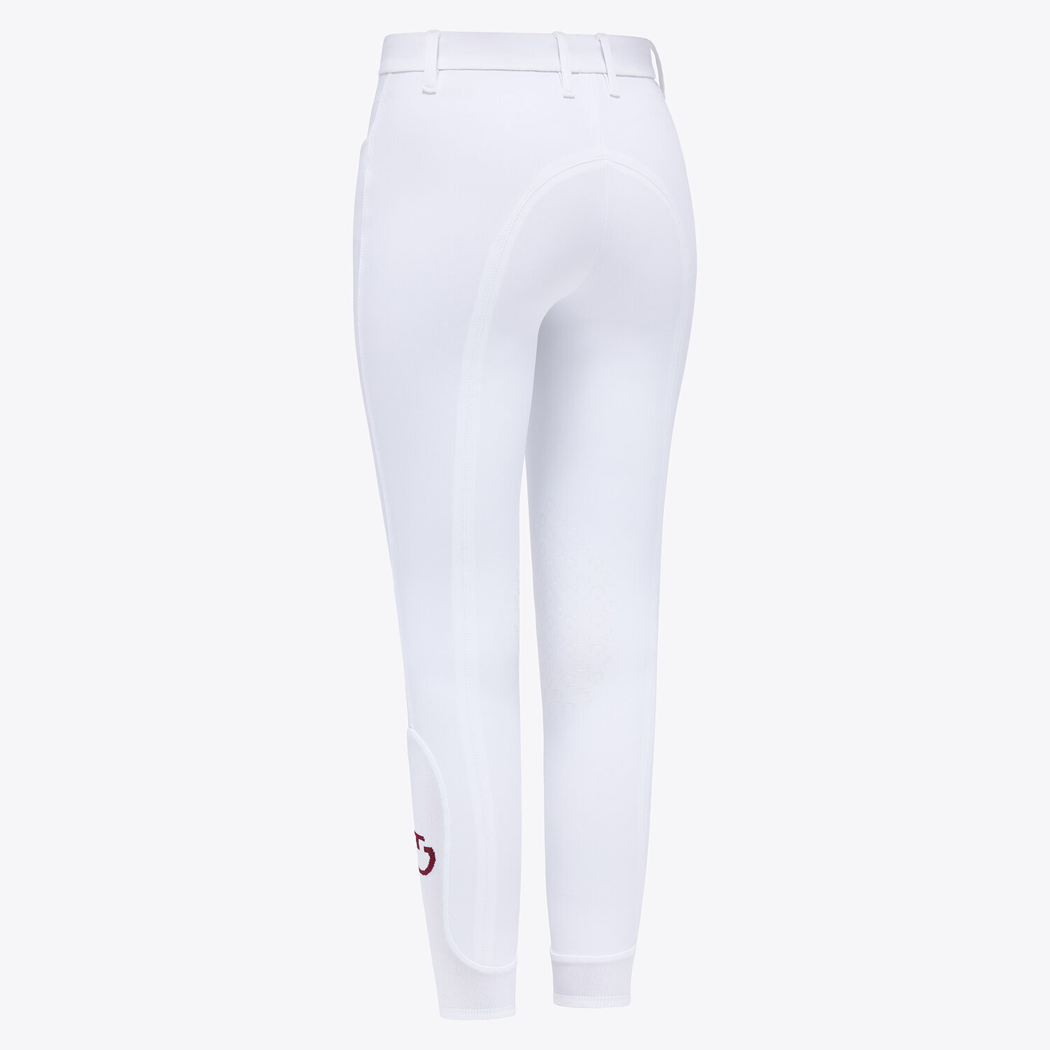 The bi-stretch technical fabric used to make the Cavalleria Toscana riding breeches for girls guarantees maximum comfort by perfectly following the movements of the body during the ride. The fabric is also breathable and antibacterial for the best comfort during training. The transparent grip at the knee allows stability on the crotch, while the elastic socks decorated with a contrasting logo offer a comfortable fit under the boots. The trousers feature two side pockets and a zip and button closure.
