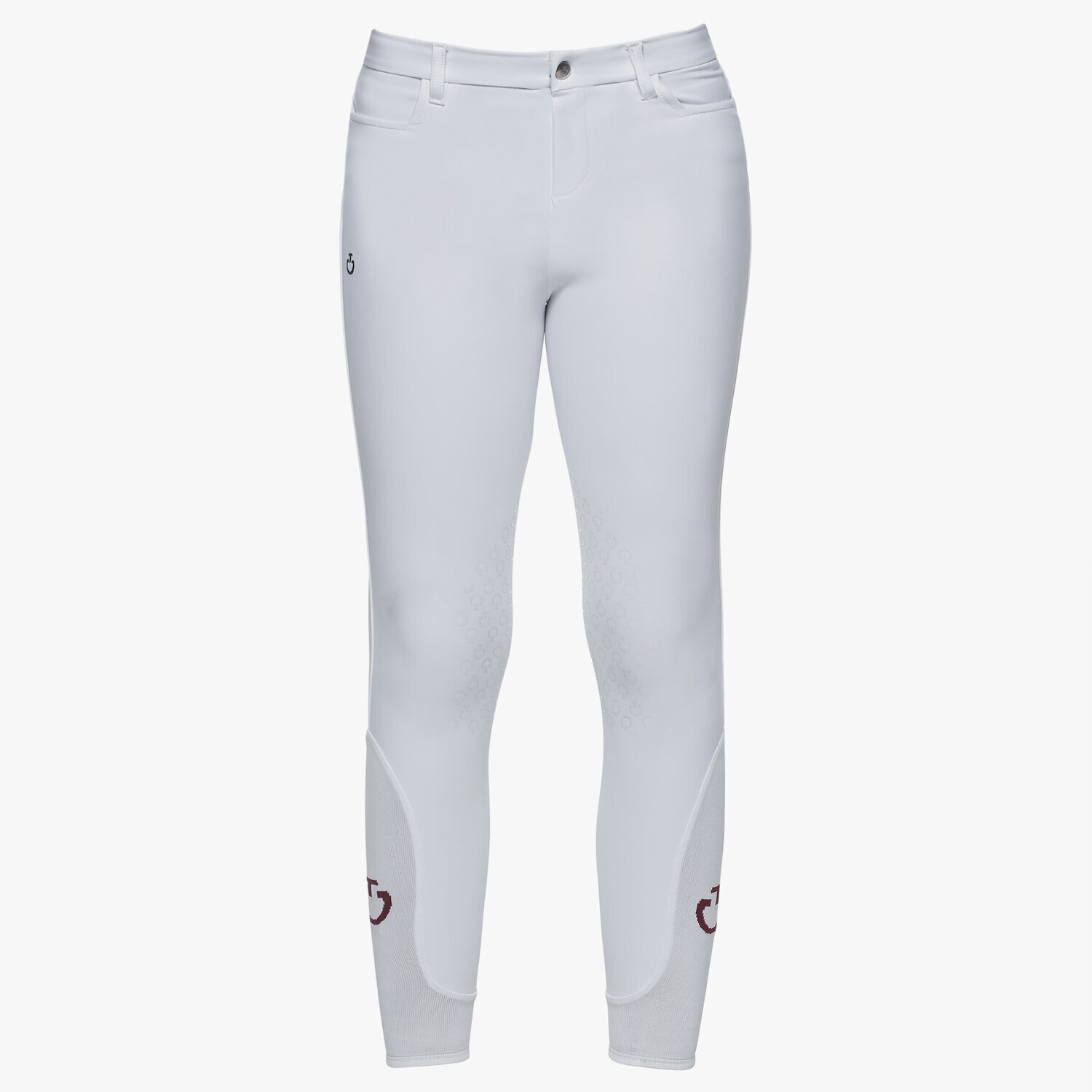 The bi-stretch technical fabric used to make the Cavalleria Toscana riding breeches for boys guarantees maximum comfort by perfectly following the movements of the body during the ride. The fabric is also breathable and antibacterial for the best comfort during training. The transparent grip at the knee allows stability on the crotch, while the elastic socks decorated with a contrasting logo offer a comfortable fit under the boots. The trousers feature two side pockets and a zip and button closure.
